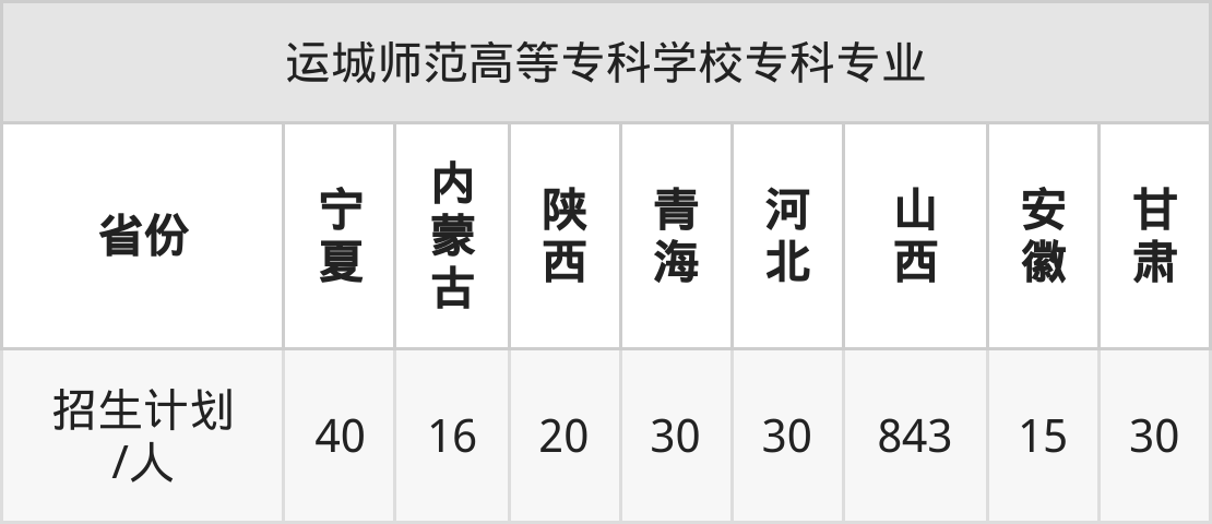 运城师范高等专科学校面向河北(30人)、山西(843人)、安徽(15人)、甘肃(30人)、宁夏(40人)、内蒙古(16人)、陕西(20人)等8个地区开展专科招生。招生批次为专科批。