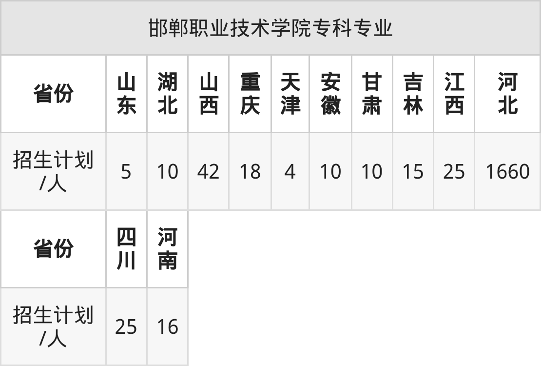 邯郸职业技术学院面向重庆(18人)、四川(25人)、甘肃(10人)、江西(25人)、山东(5人)、山西(42人)、天津(4人)等12个地区开展专科招生。其中山东招生批次为二段,其余省份为专科批。