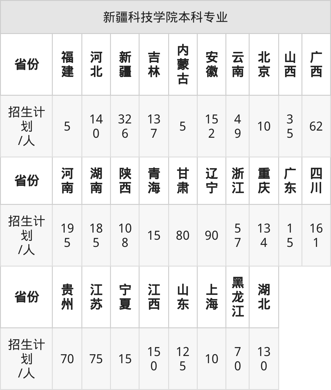 新疆科技学院面向安徽(152人)、山西(35人)、浙江(57人)、广东(15人)、新疆(326人)、山东(125人)、河北(140人)等28个地区开展本科招生。其中宁夏招生批次为第二批本科,新疆、内蒙古、陕西、四川、河南招生批次为本科二批,其余省份为本科批。