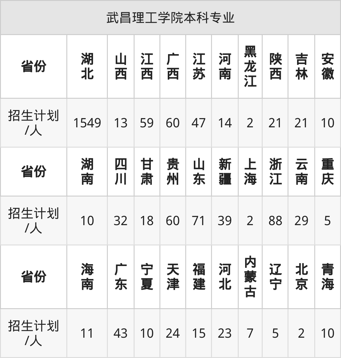 武昌理工学院面向贵州(60人)、广东(43人)、甘肃(18人)、黑龙江(2人)、陕西(21人)、云南(29人)、青海(10人)等30个地区开展本科招生。其中宁夏招生批次为第二批本科,新疆、陕西、四川、内蒙古、河南招生批次为本科二批,其余省份为本科批。