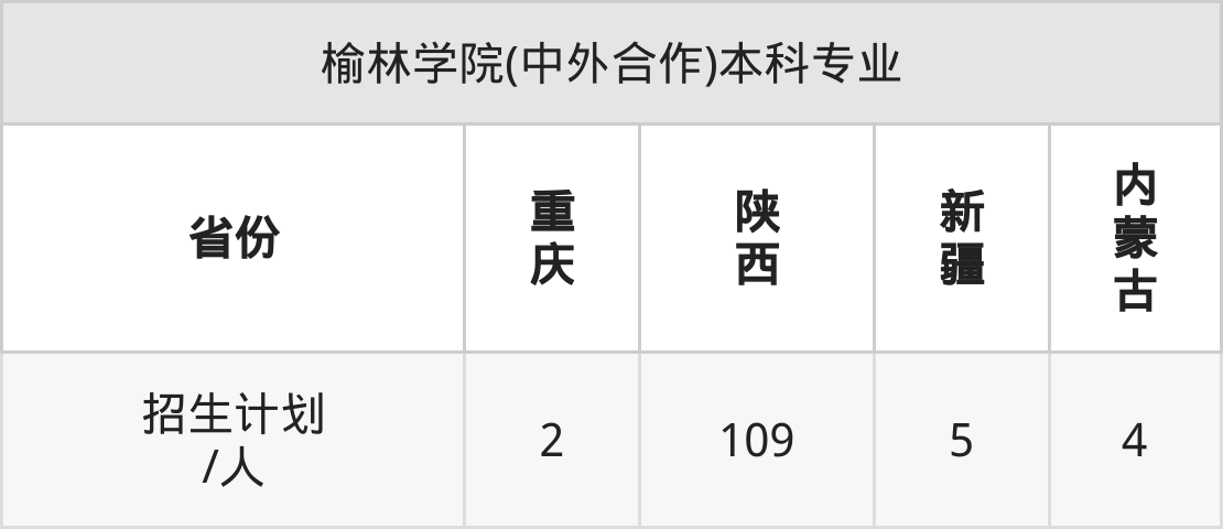榆林学院(中外合作)面向重庆(2人)、陕西(109人)、新疆(5人)、内蒙古(4人)开展本科招生。其中重庆招生批次为本科批,其余省份为本科二批。