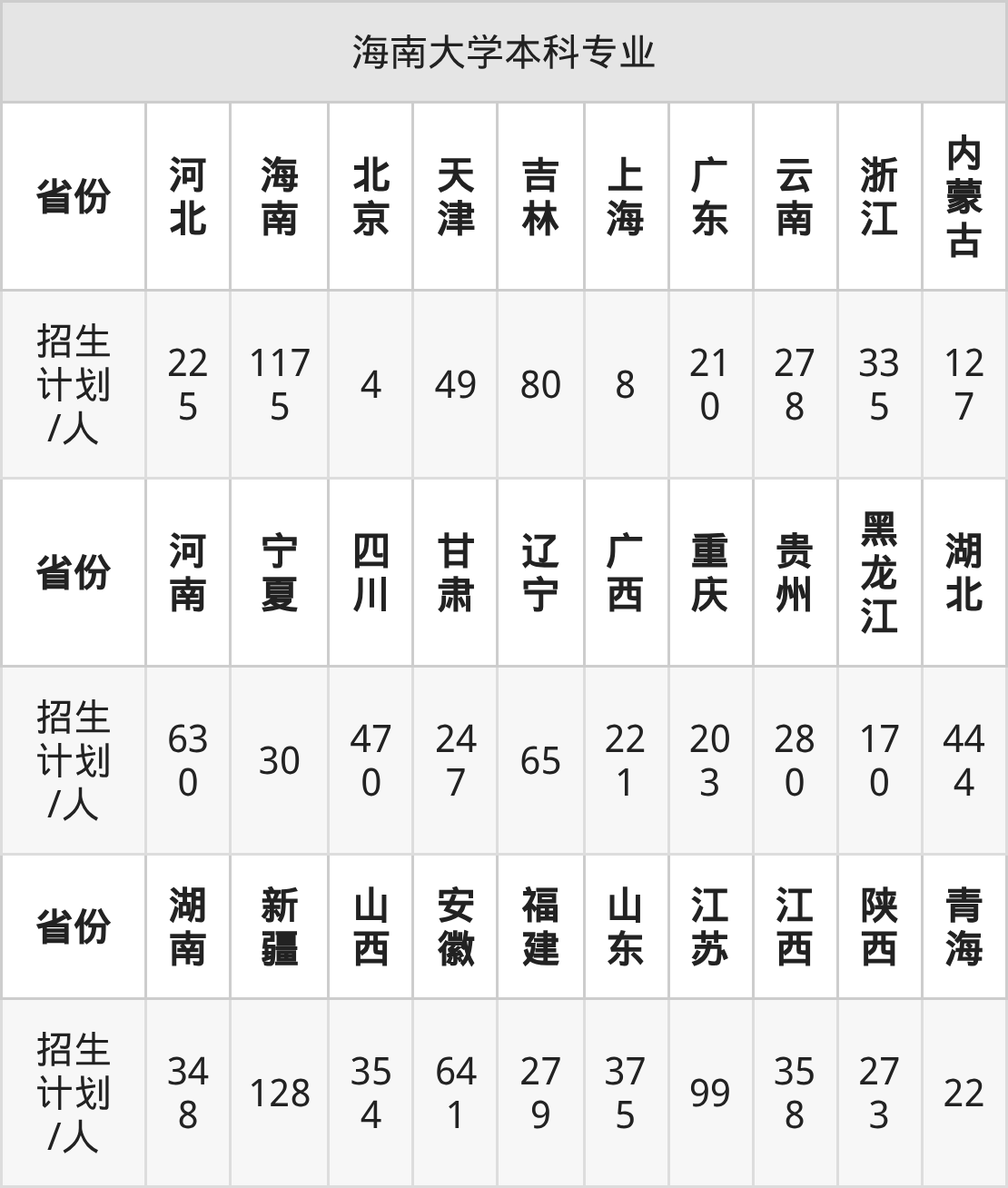 海南大学面向山东(375人)、广东(210人)、江西(358人)、海南(1175人)、陕西(273人)、北京(4人)、宁夏(30人)等30个地区开展本科招生。其中新疆招生批次为本科一批,云南、四川、宁夏招生批次为本科批B段,其余省份为本科批。