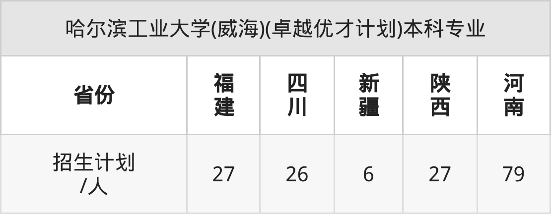 哈尔滨工业大学(威海)(卓越优才计划)面向河南(79人)、福建(27人)、四川(26人)、新疆(6人)、陕西(27人)开展本科招生。其中福建招生批次为本科批,其余省份为本科一批。