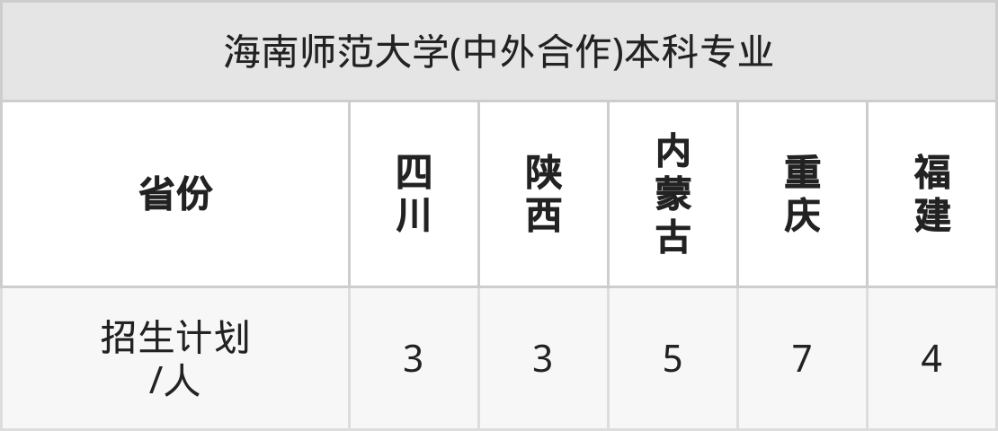 海南师范大学(中外合作)面向福建(4人)、四川(3人)、陕西(3人)、内蒙古(5人)、重庆(7人)开展本科招生。其中内蒙古招生批次为本科二批,其余省份为本科批。