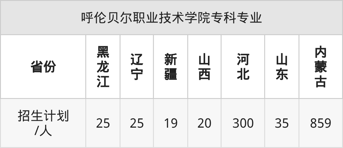 呼伦贝尔职业技术学院面向内蒙古(859人)、黑龙江(25人)、辽宁(25人)、新疆(19人)、山西(20人)、河北(300人)、山东(35人)等7个地区开展专科招生。其中山东招生批次为二段,其余省份为专科批。
