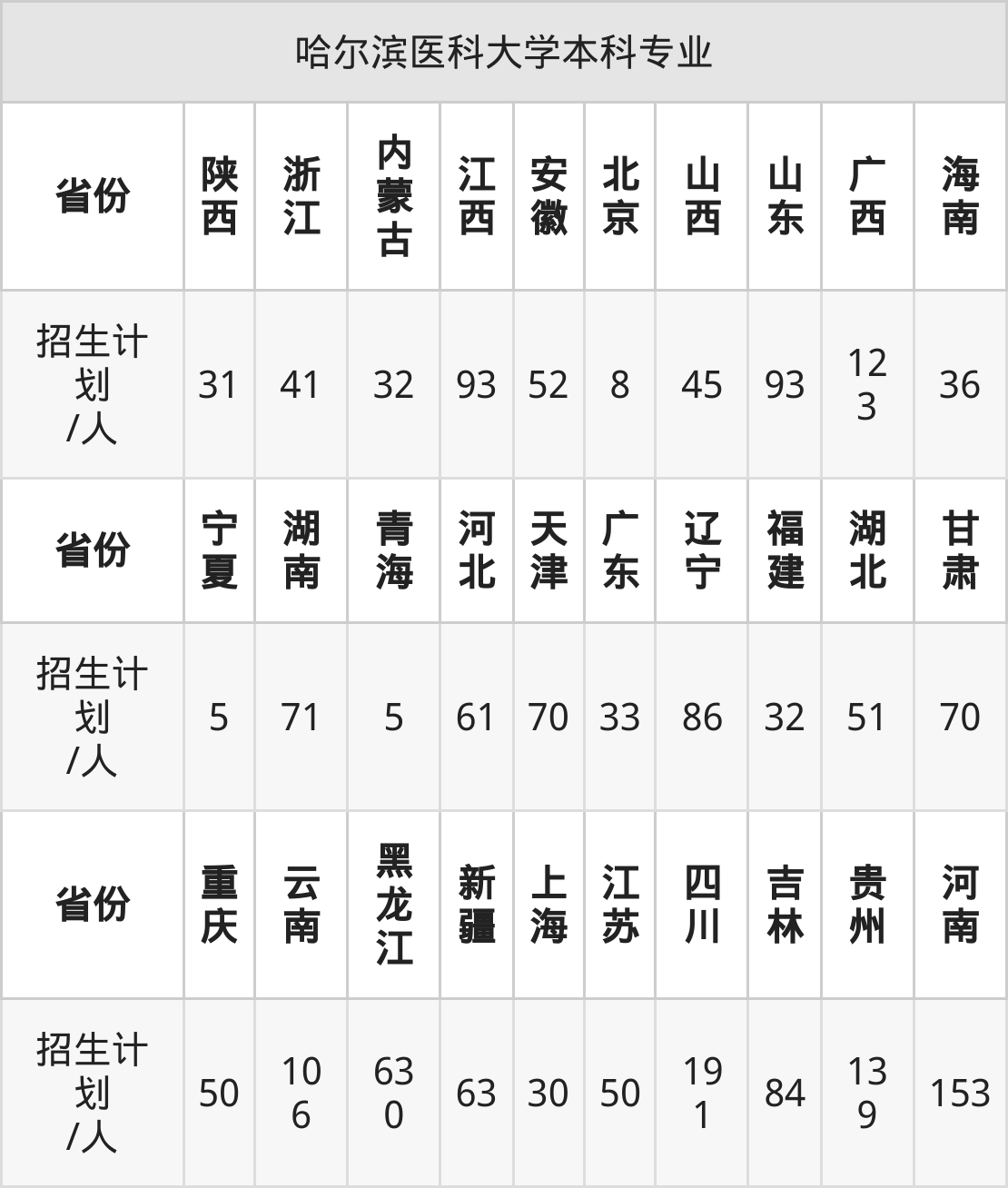 哈尔滨医科大学面向贵州(139人)、广西(123人)、辽宁(86人)、湖北(51人)、广东(33人)、云南(106人)、福建(32人)等30个地区开展本科招生。其中内蒙古、新疆、河南、四川招生批次为本科二批,其余省份为本科批。