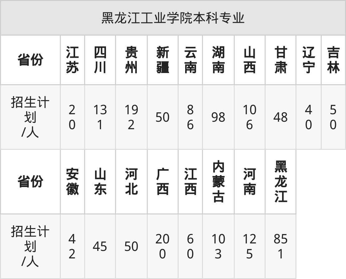 黑龙江工业学院面向广西(200人)、甘肃(48人)、江苏(20人)、河南(125人)、吉林(50人)、湖南(98人)、安徽(42人)等18个地区开展本科招生。其中山西招生批次为第二批本科B类,四川、河南、新疆、内蒙古招生批次为本科二批,其余省份为本科批。