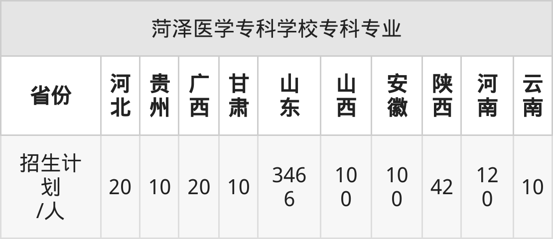 菏泽医学专科学校面向贵州(10人)、广西(20人)、甘肃(10人)、云南(10人)、河北(20人)、山西(100人)、安徽(100人)等10个地区开展专科招生。其中山东招生批次为二段,其余省份为专科批。