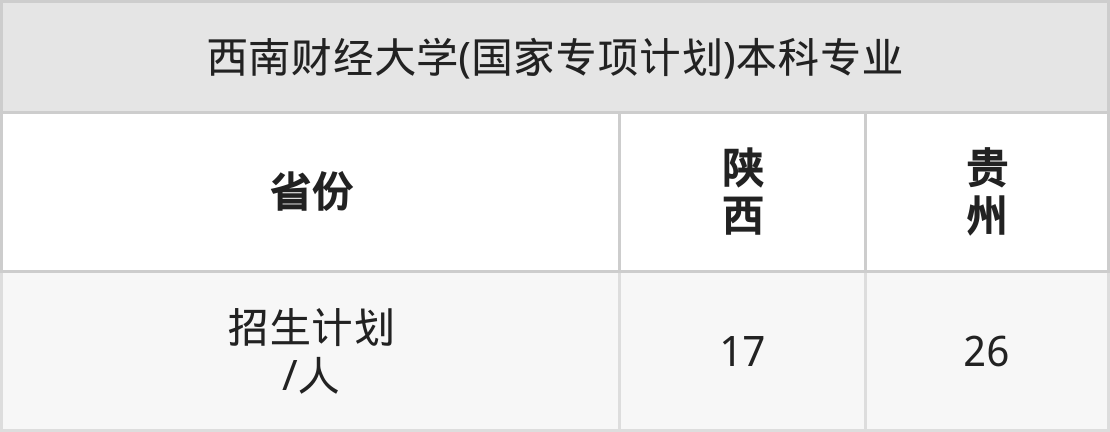 西南财经大学(国家专项计划)面向贵州(26人)、陕西(17人)开展本科招生。招生批次为本科批。