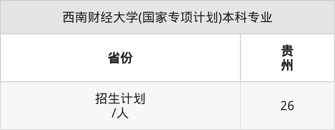 西南财经大学(国家专项计划)面向贵州(26人)开展本科招生。招生批次为本科批。