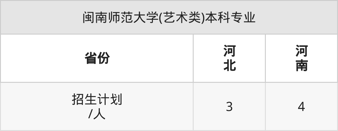 闽南师范大学(艺术类)面向河北(3人)、河南(4人)开展本科招生。招生批次为本科二批。