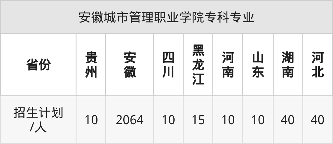 安徽城市管理职业学院面向河北(40人)、贵州(10人)、安徽(2064人)、四川(10人)、黑龙江(15人)、河南(10人)、山东(10人)等8个地区开展专科招生。其中山东招生批次为二段,其余省份为专科批。