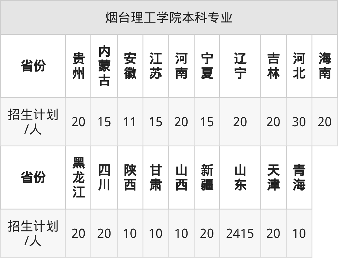 烟台理工学院面向陕西(10人)、甘肃(10人)、宁夏(15人)、青海(10人)、安徽(11人)、天津(20人)、四川(20人)等19个地区开展本科招生。其中山西招生批次为第二批本科C类,四川、河南、新疆、陕西、内蒙古招生批次为本科二批,其余省份为本科批。