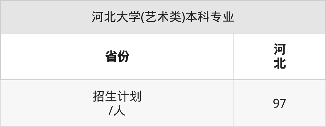河北大学(艺术类)面向河北(97人)开展本科招生。招生批次为本科批。