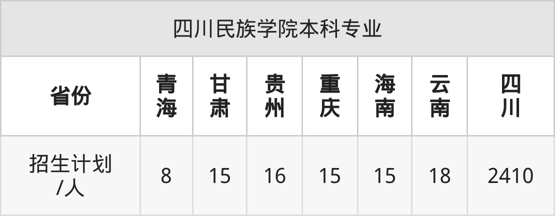 四川民族学院面向青海(8人)、海南(15人)、重庆(15人)、贵州(16人)、四川(2410人)、甘肃(15人)、云南(18人)等7个地区开展本科招生。其中青海招生批次为本科一段,其余省份为本科批。