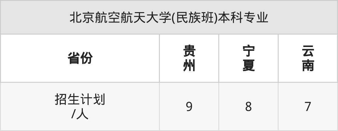 北京航空航天大学(民族班)面向宁夏(8人)、云南(7人)、贵州(9人)开展本科招生。招生批次为本科批。