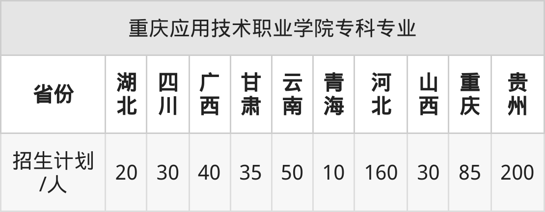重庆应用技术职业学院面向河北(160人)、山西(30人)、重庆(85人)、贵州(200人)、四川(30人)、湖北(20人)、青海(10人)等10个地区开展专科招生。招生批次为专科批。