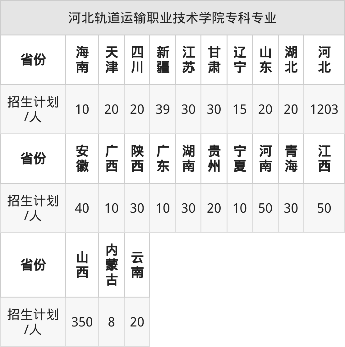 河北轨道运输职业技术学院面向陕西(30人)、新疆(39人)、江苏(30人)、青海(30人)、湖北(20人)、湖南(30人)、四川(20人)等23个地区开展专科招生。其中山东招生批次为二段,其余省份为专科批。