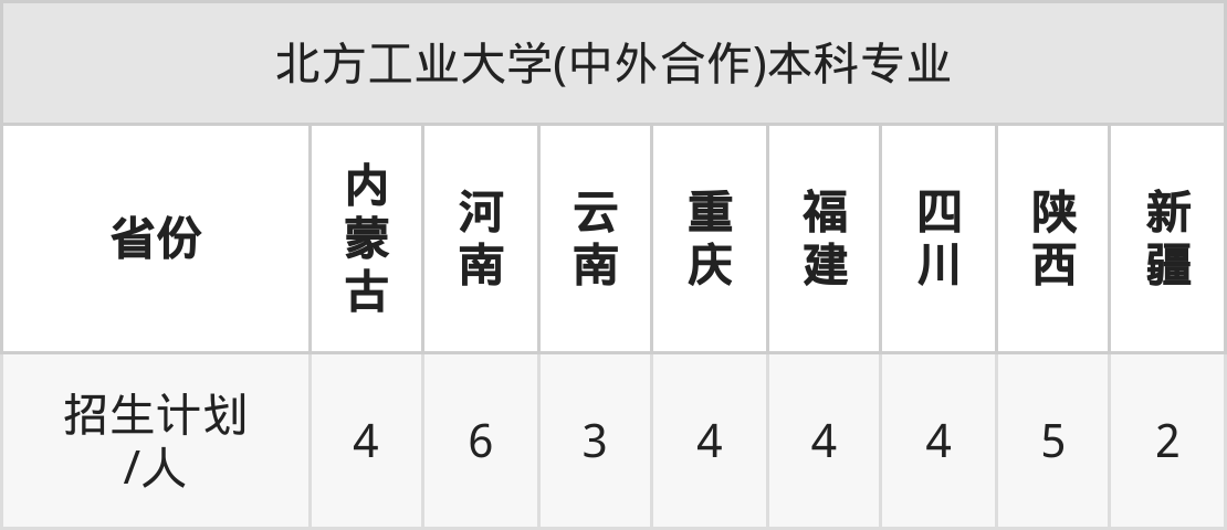 北方工业大学(中外合作)面向内蒙古(4人)、河南(6人)、云南(3人)、重庆(4人)、福建(4人)、四川(4人)、陕西(5人)等8个地区开展本科招生。其中云南招生批次为一本,重庆、福建招生批次为本科批,其余省份为本科一批。