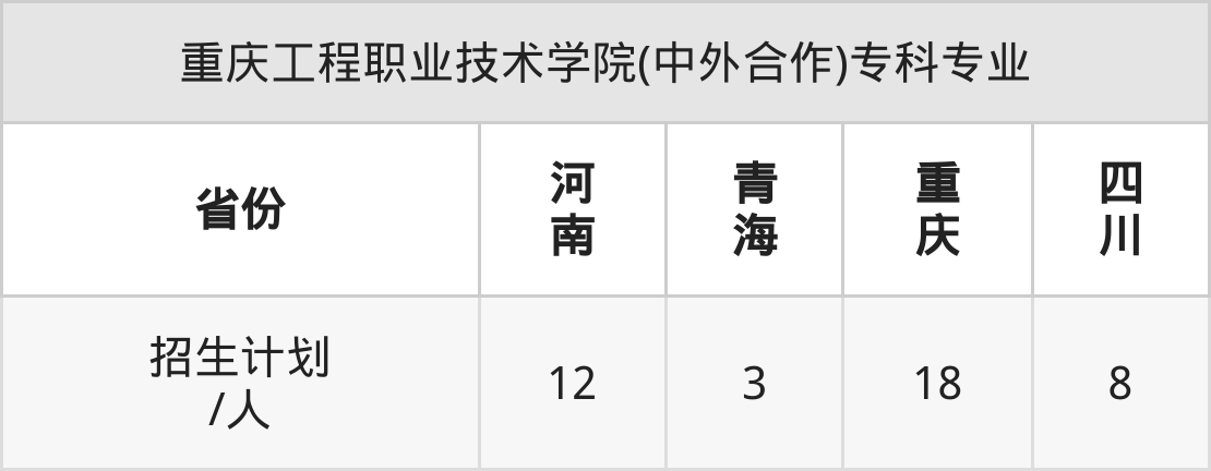 重庆工程职业技术学院(中外合作)面向河南(12人)、青海(3人)、重庆(18人)、四川(8人)开展专科招生。招生批次为专科批。