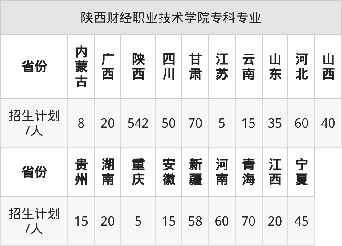 陕西财经职业技术学院面向新疆(58人)、甘肃(70人)、江苏(5人)、山东(35人)、山西(40人)、重庆(5人)、云南(15人)等19个地区开展专科招生。其中山东招生批次为二段,其余省份为专科批。