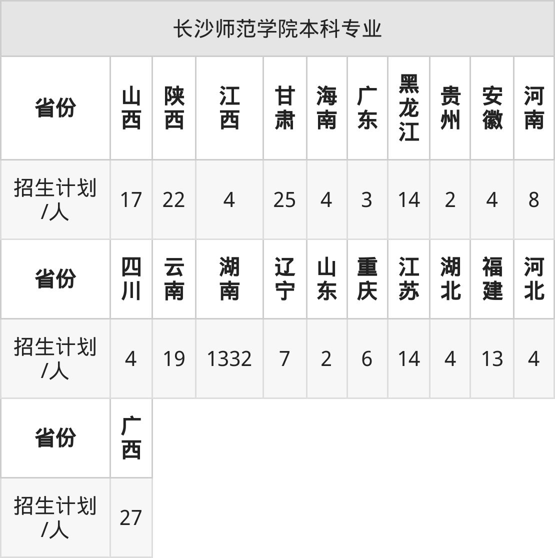 长沙师范学院面向广东(3人)、陕西(22人)、江苏(14人)、云南(19人)、山东(2人)、湖南(1332人)、福建(13人)等21个地区开展本科招生。其中山西招生批次为第二批本科B类,陕西、河南、四川招生批次为本科二批,其余省份为本科批。