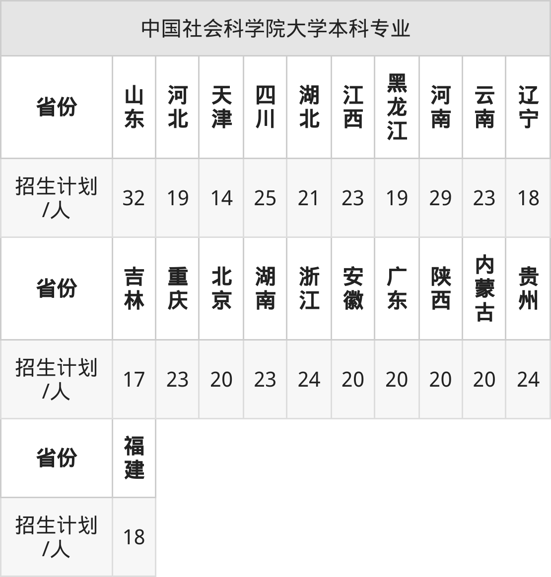 中国社会科学院大学面向辽宁(18人)、山东(32人)、重庆(23人)、天津(14人)、广东(20人)、四川(25人)、黑龙江(19人)等21个地区开展本科招生。其中河北招生批次为本科提前批B,四川、河南、内蒙古、陕西招生批次为本科一批,其余省份为本科批。