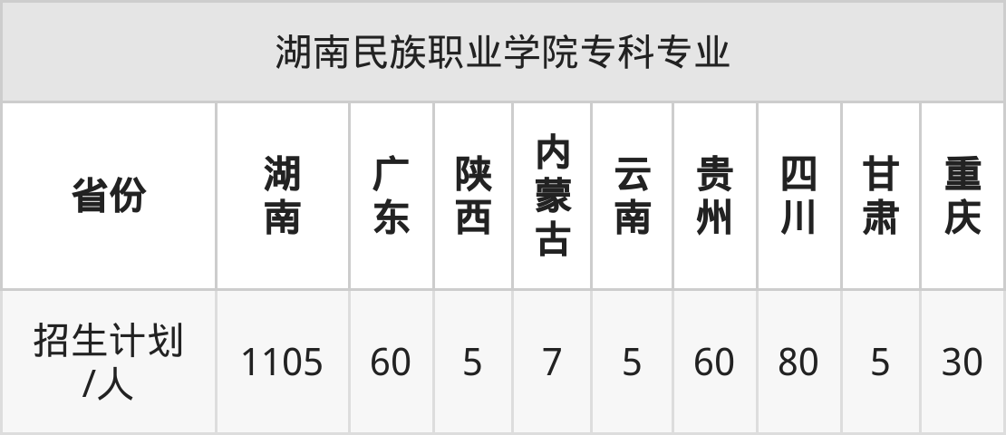 湖南民族职业学院面向四川(80人)、陕西(5人)、甘肃(5人)、云南(5人)、湖南(1105人)、重庆(30人)、贵州(60人)等9个地区开展专科招生。招生批次为专科批。