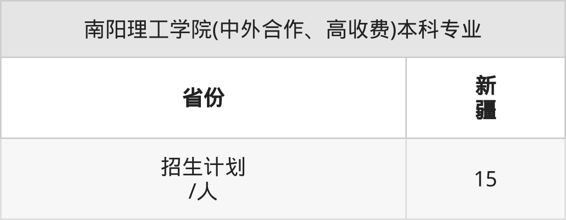 南阳理工学院(中外合作、高收费)面向新疆(15人)开展本科招生。招生批次为本科二批。