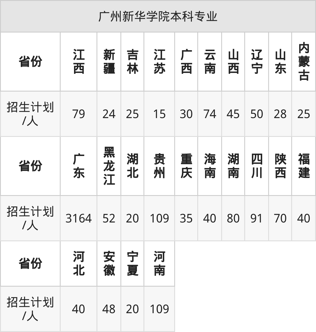 广州新华学院面向山西(45人)、广东(3164人)、黑龙江(52人)、吉林(25人)、江西(79人)、河北(40人)、河南(109人)等24个地区开展本科招生。其中云南招生批次为二本,河南、陕西、新疆、内蒙古、四川招生批次为本科二批,其余省份为本科批。