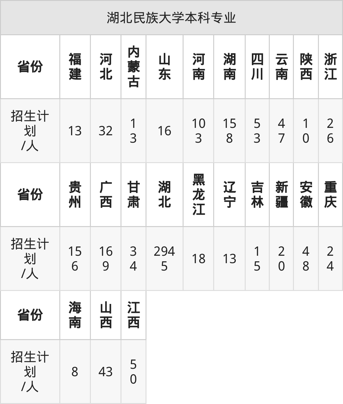 湖北民族大学面向甘肃(34人)、新疆(20人)、辽宁(13人)、江西(50人)、浙江(26人)、内蒙古(13人)、吉林(15人)等23个地区开展本科招生。其中河南、四川、陕西、新疆、内蒙古招生批次为本科二批,其余省份为本科批。
