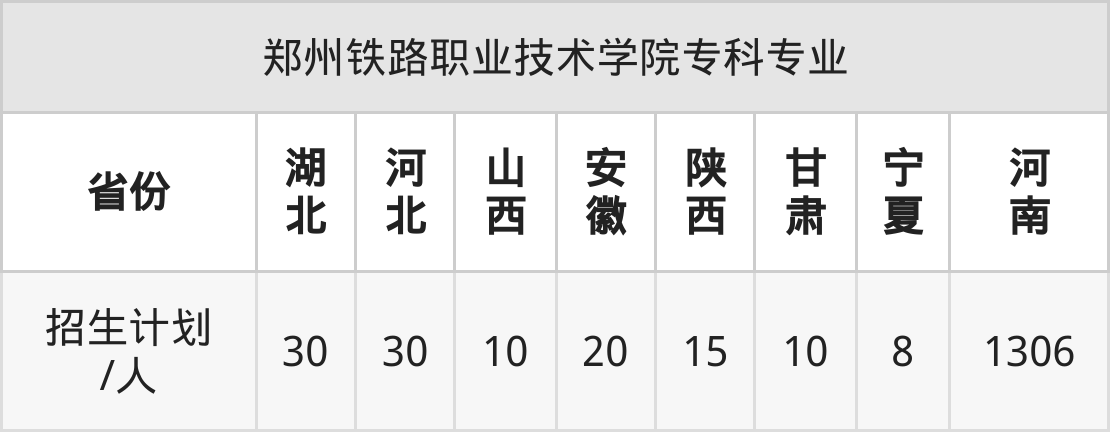 郑州铁路职业技术学院面向甘肃(10人)、宁夏(8人)、河南(1306人)、湖北(30人)、河北(30人)、山西(10人)、安徽(20人)等8个地区开展专科招生。招生批次为专科批。
