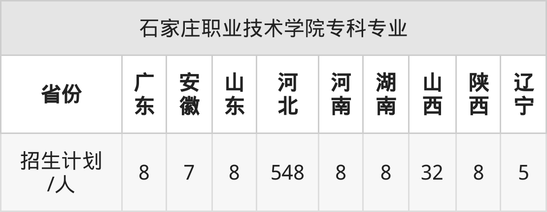 石家庄职业技术学院面向山东(8人)、河北(548人)、安徽(7人)、广东(8人)、河南(8人)、辽宁(5人)、湖南(8人)等9个地区开展专科招生。其中山东招生批次为二段,其余省份为专科批。
