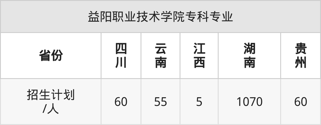 益阳职业技术学院面向湖南(1070人)、贵州(60人)、四川(60人)、云南(55人)、江西(5人)开展专科招生。招生批次为专科批。