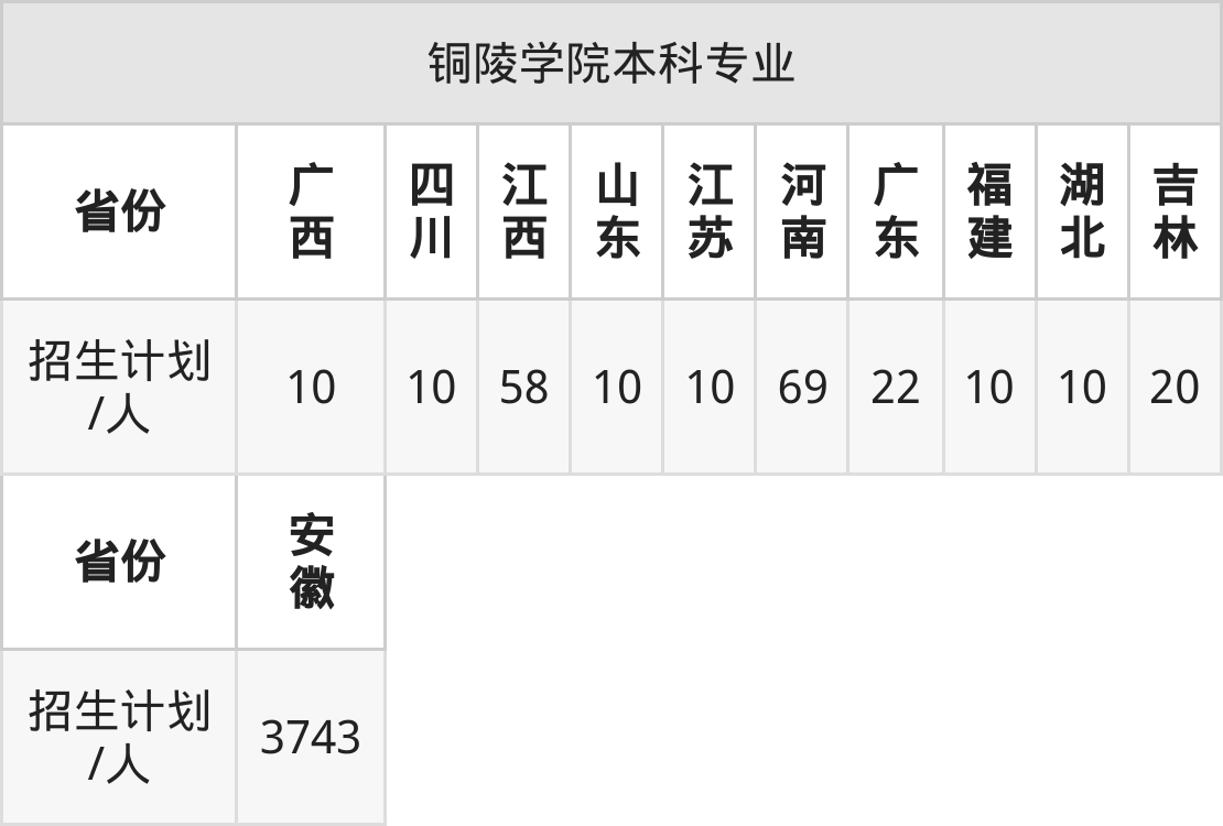 铜陵学院面向江苏(10人)、河南(69人)、山东(10人)、湖北(10人)、安徽(3743人)、广东(22人)、四川(10人)等11个地区开展本科招生。其中山东招生批次为一段,河南、四川招生批次为本科二批,其余省份为本科批。