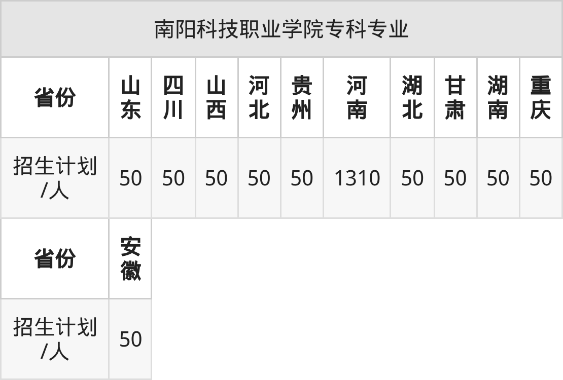 南阳科技职业学院面向湖南(50人)、河北(50人)、贵州(50人)、山东(50人)、河南(1310人)、四川(50人)、重庆(50人)等11个地区开展专科招生。其中山东招生批次为二段,其余省份为专科批。