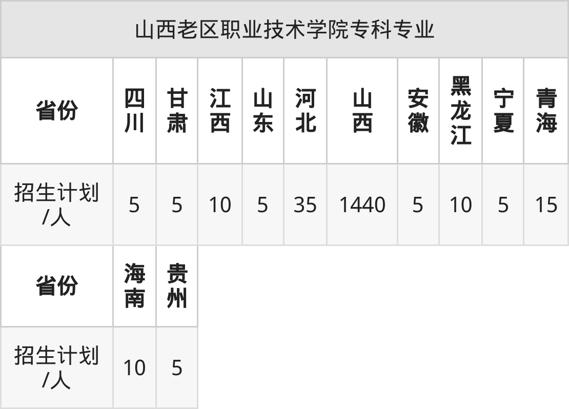 山西老区职业技术学院面向山东(5人)、安徽(5人)、黑龙江(10人)、宁夏(5人)、青海(15人)、江西(10人)、海南(10人)等12个地区开展专科招生。其中山东招生批次为二段,其余省份为专科批。