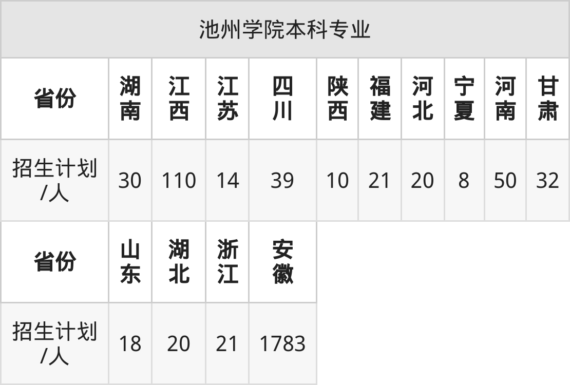 池州学院面向江西(110人)、陕西(10人)、甘肃(32人)、河南(50人)、浙江(21人)、安徽(1783人)、福建(21人)等14个地区开展本科招生。其中山东招生批次为一段,河南、四川、陕西招生批次为本科二批,其余省份为本科批。