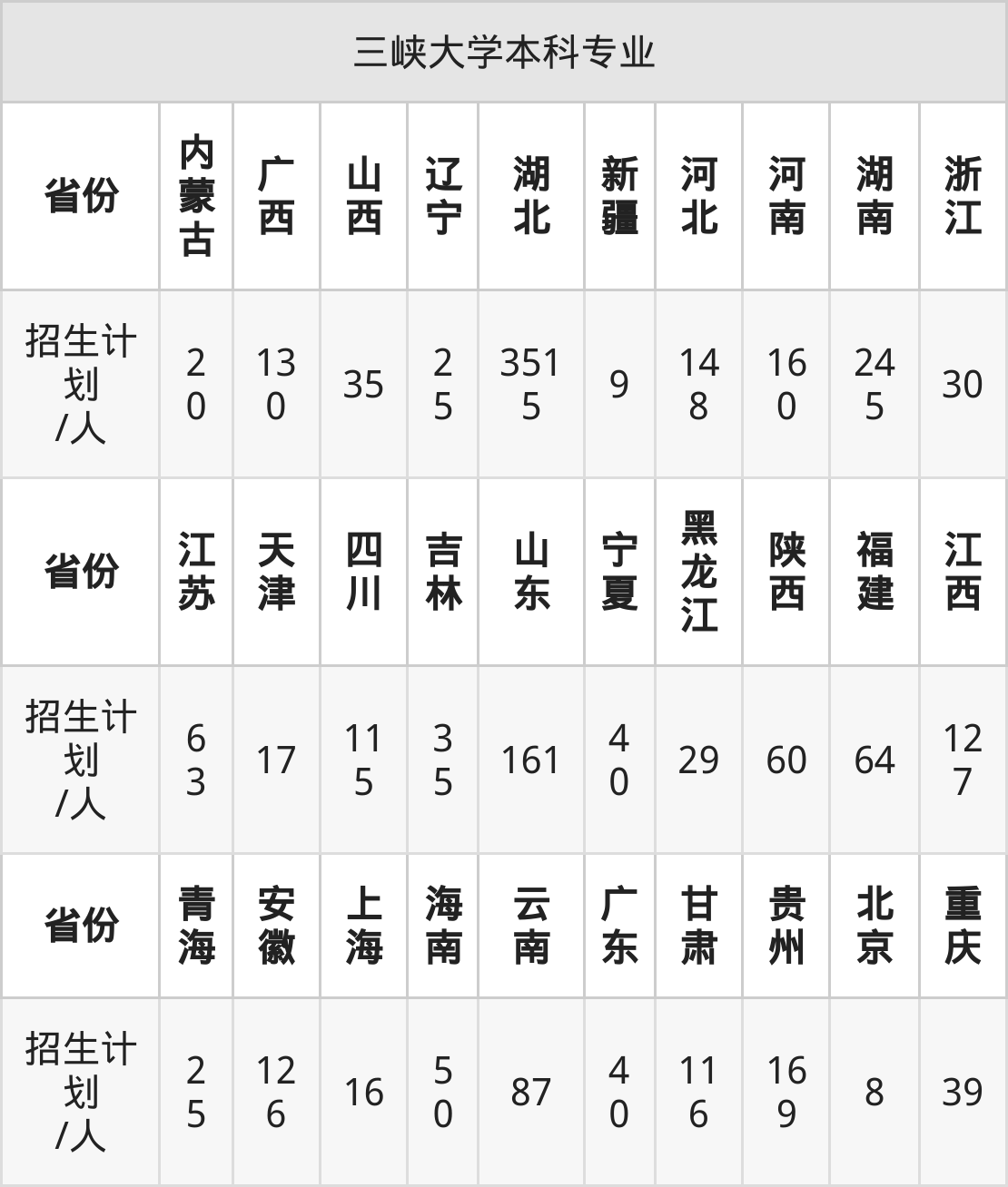三峡大学面向湖南(245人)、重庆(39人)、四川(115人)、广西(130人)、青海(25人)、吉林(35人)、贵州(169人)等30个地区开展本科招生。其中宁夏招生批次为第一批本科,陕西、内蒙古、河南、四川、新疆招生批次为本科一批,其余省份为本科批。