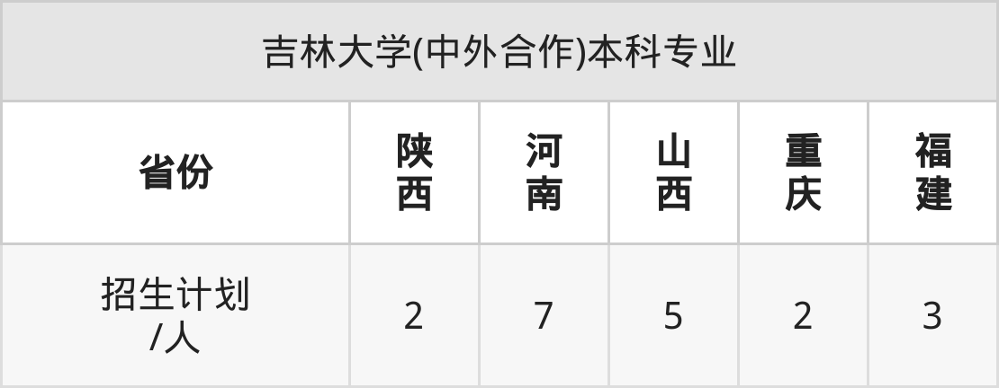 吉林大学(中外合作)面向山西(5人)、重庆(2人)、福建(3人)、陕西(2人)、河南(7人)开展本科招生。其中山西招生批次为第一批本科A1类,其余省份为本科批。