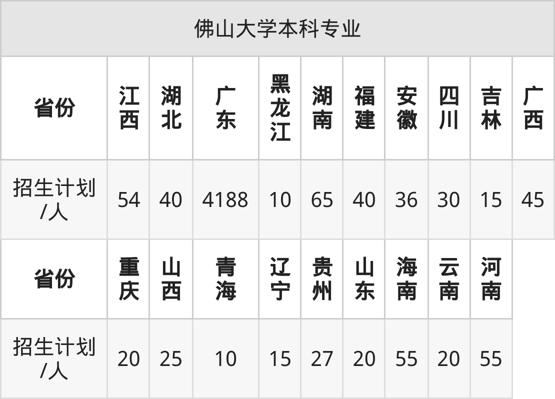 佛山大学面向福建(40人)、辽宁(15人)、黑龙江(10人)、广西(45人)、云南(20人)、江西(54人)、贵州(27人)等19个地区开展本科招生。其中云南招生批次为二本,四川、河南招生批次为本科二批,其余省份为本科批。