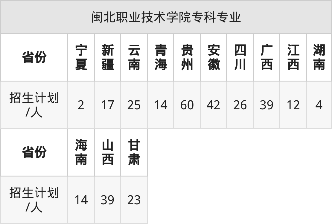 闽北职业技术学院面向四川(26人)、广西(39人)、新疆(17人)、青海(14人)、海南(14人)、山西(39人)、贵州(60人)等13个地区开展专科招生。招生批次为专科批。
