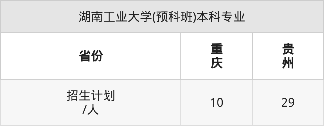 湖南工业大学(预科班)面向重庆(10人)、贵州(29人)开展本科招生。招生批次为本科批。
