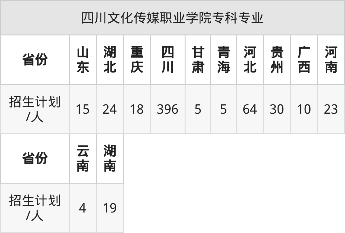 四川文化传媒职业学院面向贵州(30人)、云南(4人)、青海(5人)、山东(15人)、湖北(24人)、湖南(19人)、重庆(18人)等12个地区开展专科招生。其中山东招生批次为二段,其余省份为专科批。