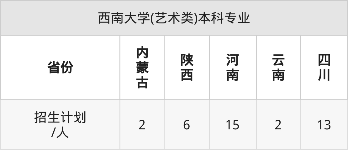 西南大学(艺术类)面向内蒙古(2人)、陕西(6人)、河南(15人)、云南(2人)、四川(13人)开展本科招生。其中云南招生批次为一本,其余省份为本科一批。