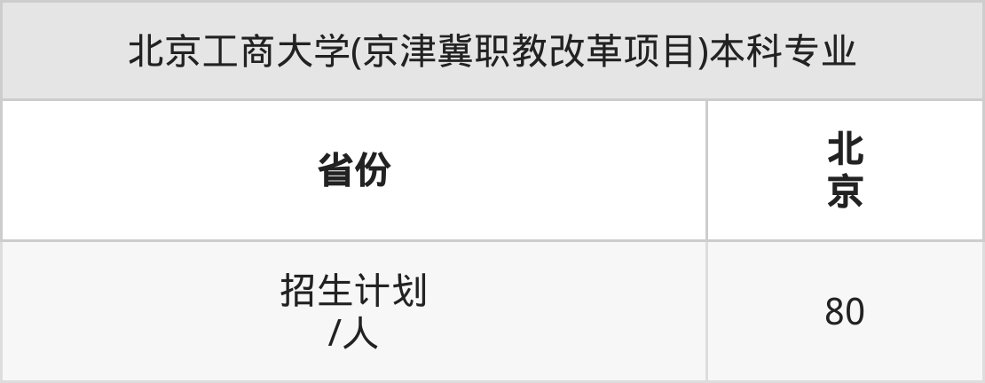 北京工商大学(京津冀职教改革项目)面向北京(80人)开展本科招生。招生批次为本科批。