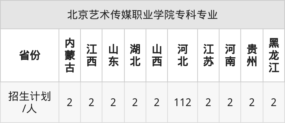 北京艺术传媒职业学院面向内蒙古(2人)、江苏(2人)、河南(2人)、山东(2人)、河北(112人)、贵州(2人)、黑龙江(2人)等10个地区开展专科招生。其中山东招生批次为二段,其余省份为专科批。