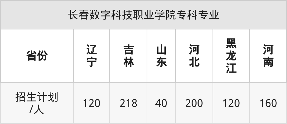 长春数字科技职业学院面向黑龙江(120人)、河南(160人)、辽宁(120人)、吉林(218人)、山东(40人)、河北(200人)开展专科招生。其中山东招生批次为二段,其余省份为专科批。