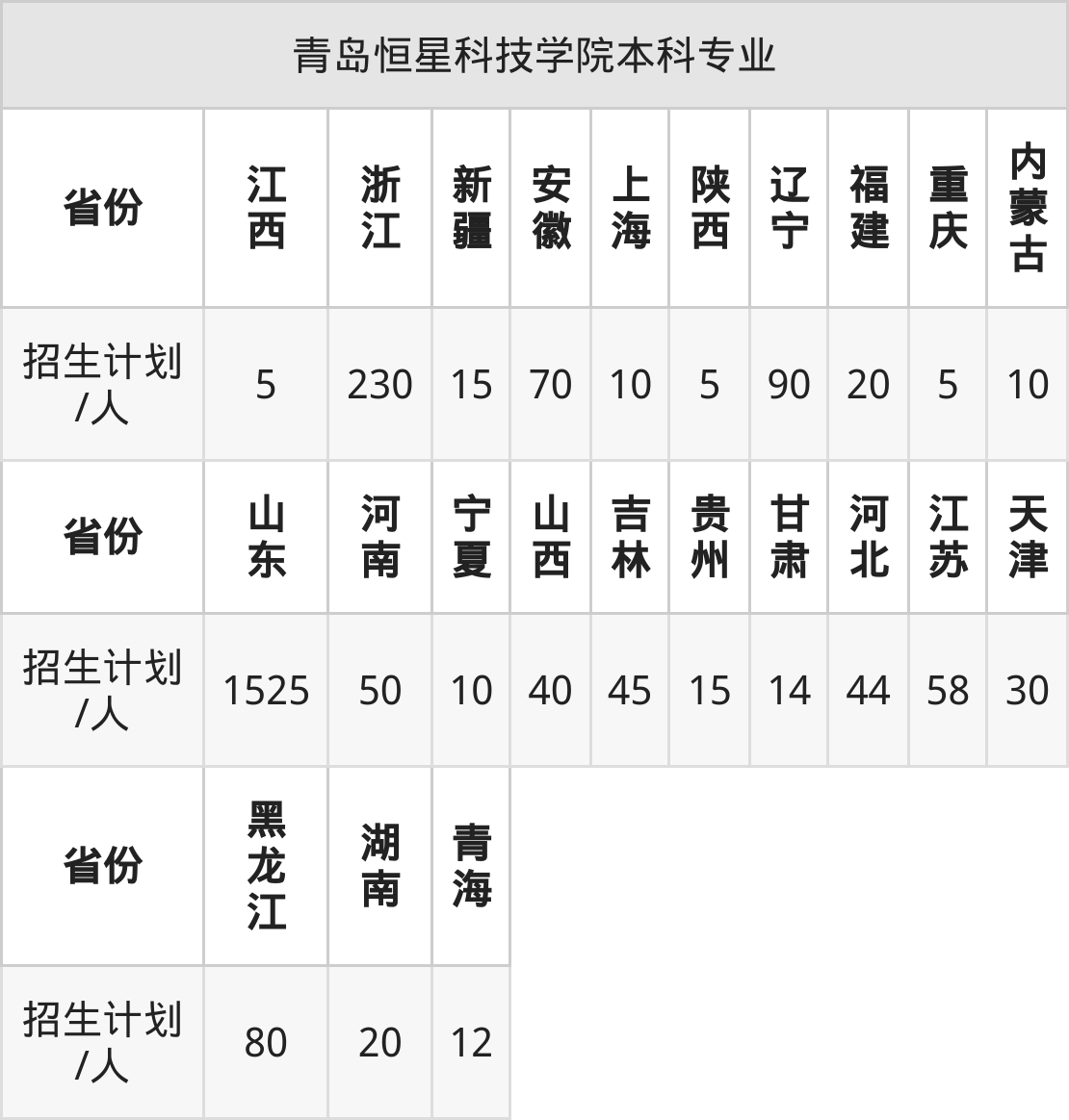 青岛恒星科技学院面向安徽(70人)、浙江(230人)、河南(50人)、上海(10人)、山东(1525人)、吉林(45人)、重庆(5人)等23个地区开展本科招生。其中青海招生批次为本科二段,新疆、陕西、内蒙古、河南招生批次为本科二批,其余省份为本科批。