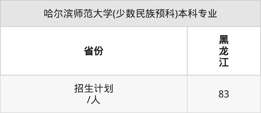 哈尔滨师范大学(少数民族预科)面向黑龙江(83人)开展本科招生。招生批次为本科批。